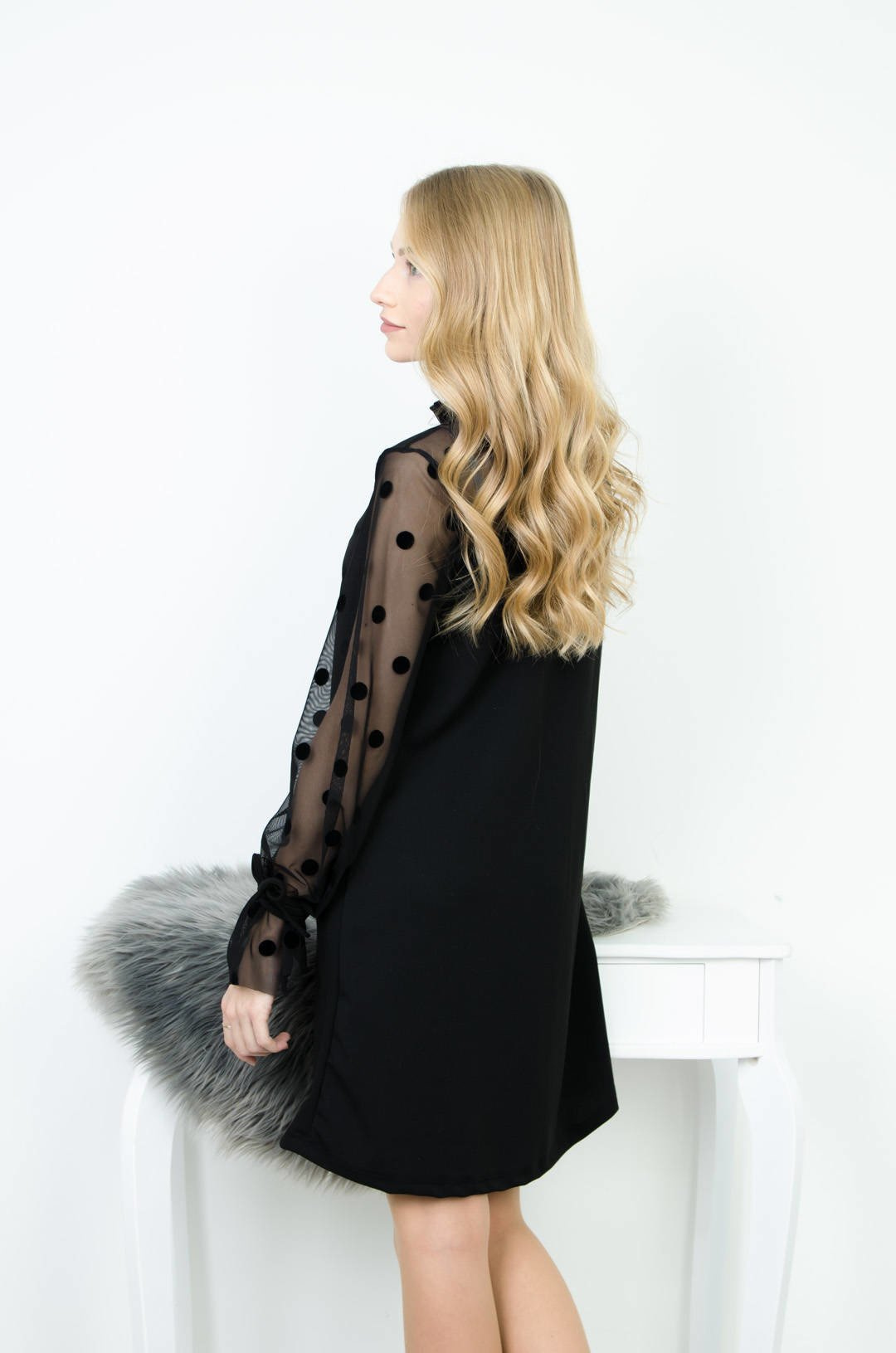 CZARNA SUKIENKA Z TIULOWĄ GÓRĄ I RĘKAWAMI W