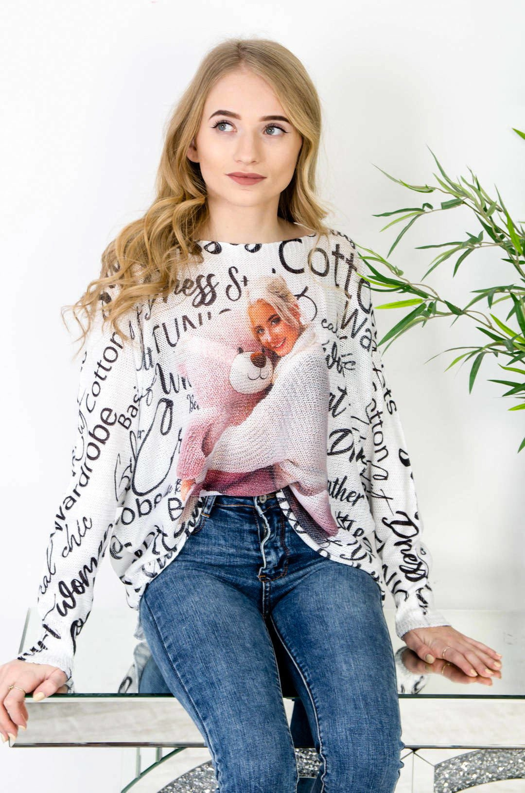 BIAŁA LUŹNA BLUZKA Z MOTYWEM DZIEWCZYNY Z MISIEM