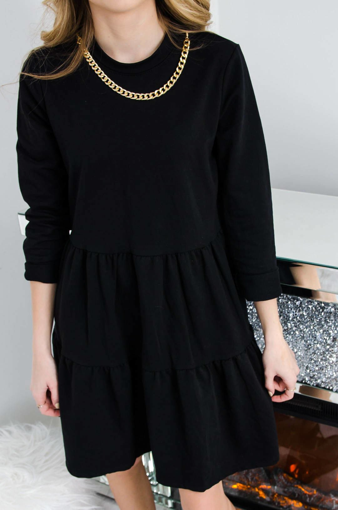 CZARNA ROZKLOSZOWANA SUKIENKA ZE ZŁOTYM ŁAŃCUSZKIEM