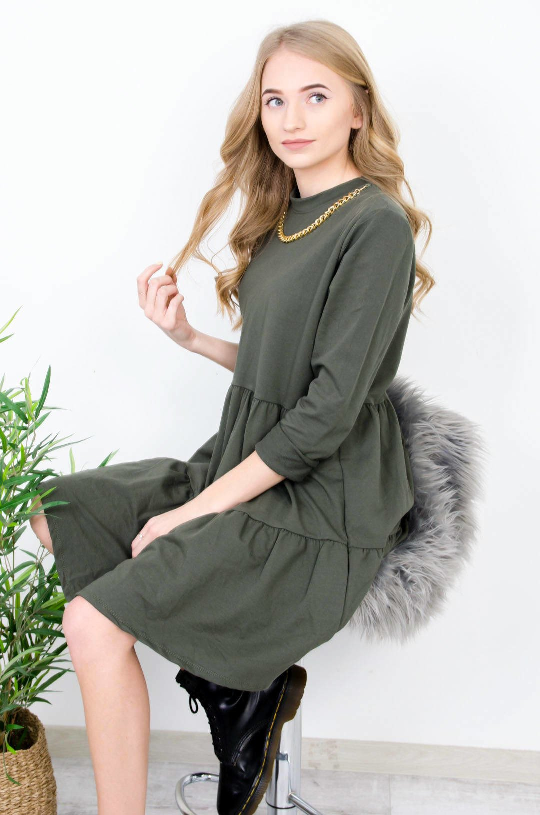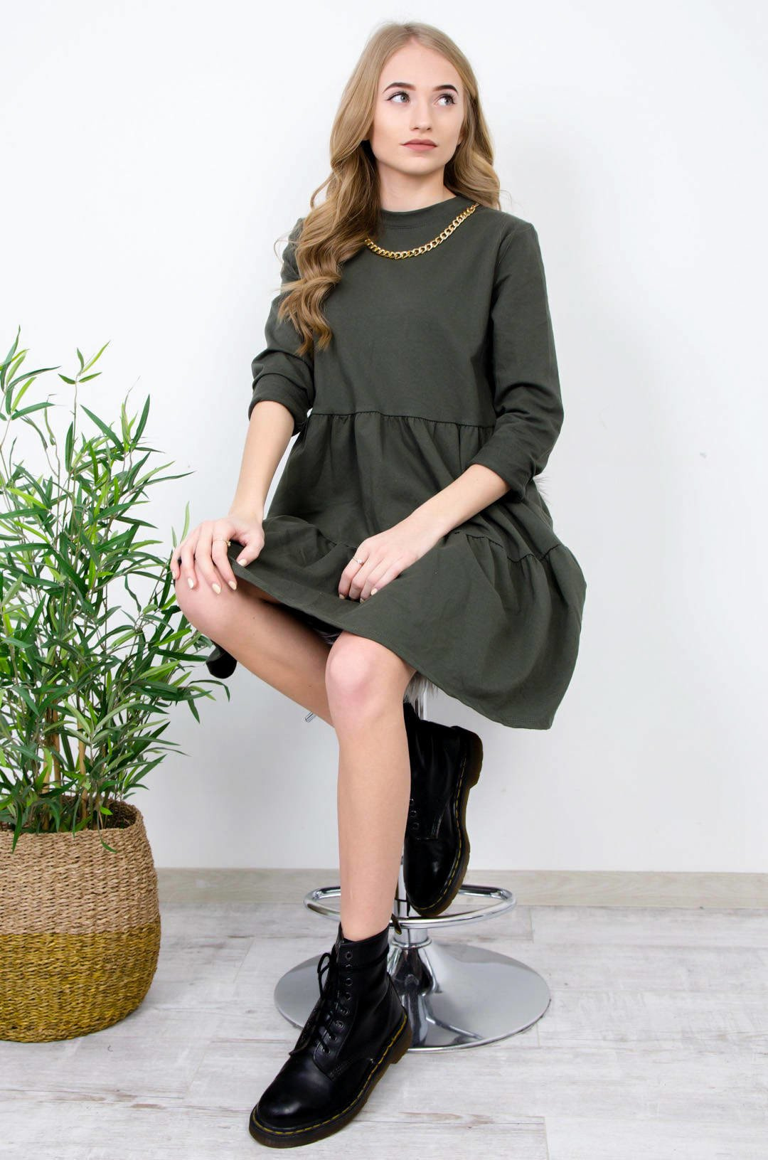 ZIELONA ROZKLOSZOWANA SUKIENKA ZE ZŁOTYM ŁAŃCUSZKIEM