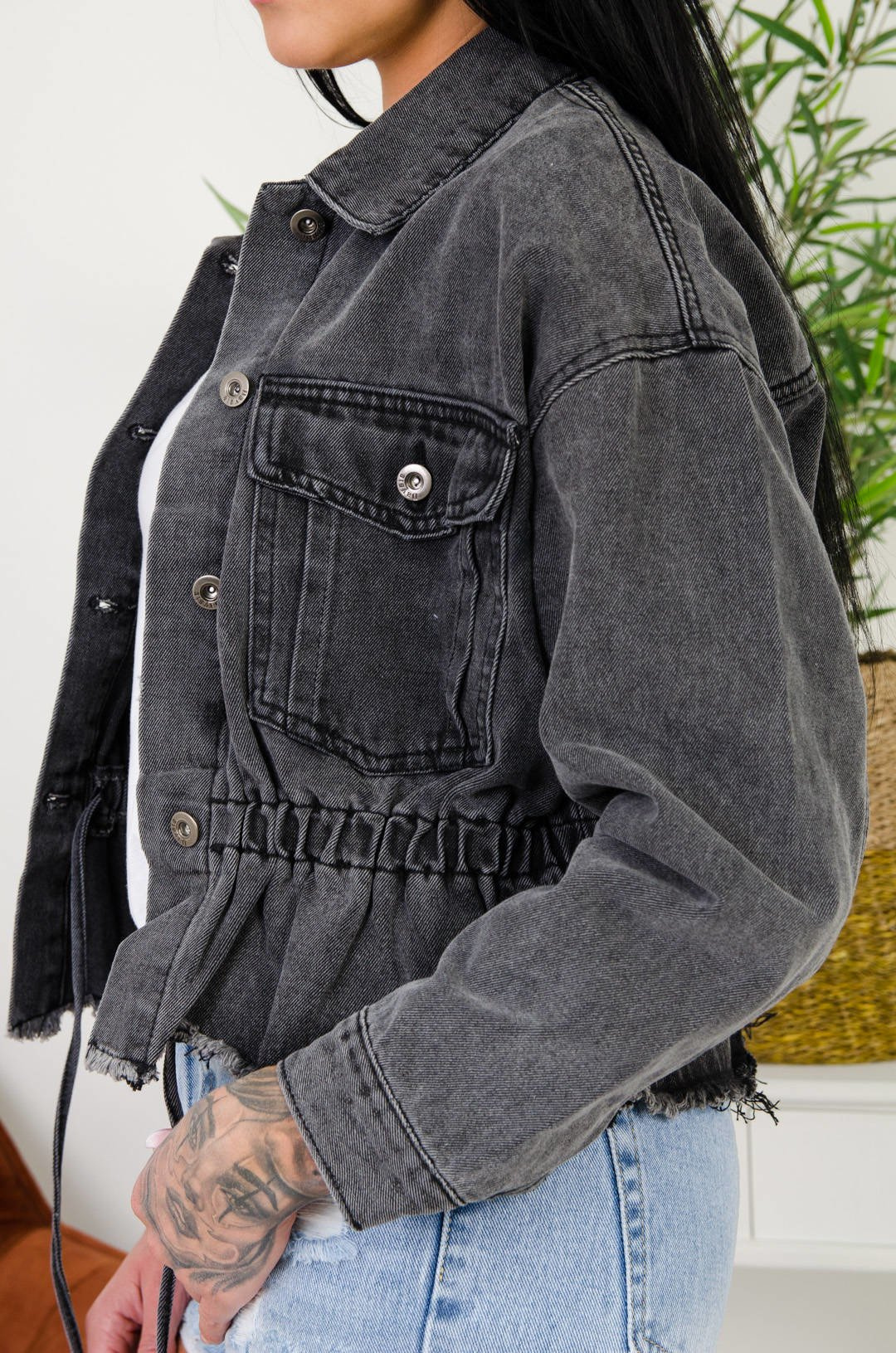 CIEMNO SZARA KURTKA JEANSOWA Z MARSZCZENIEM.
