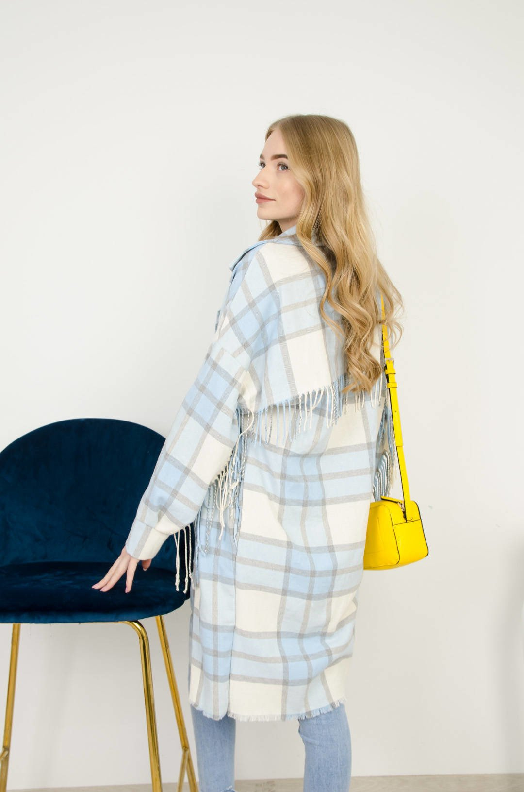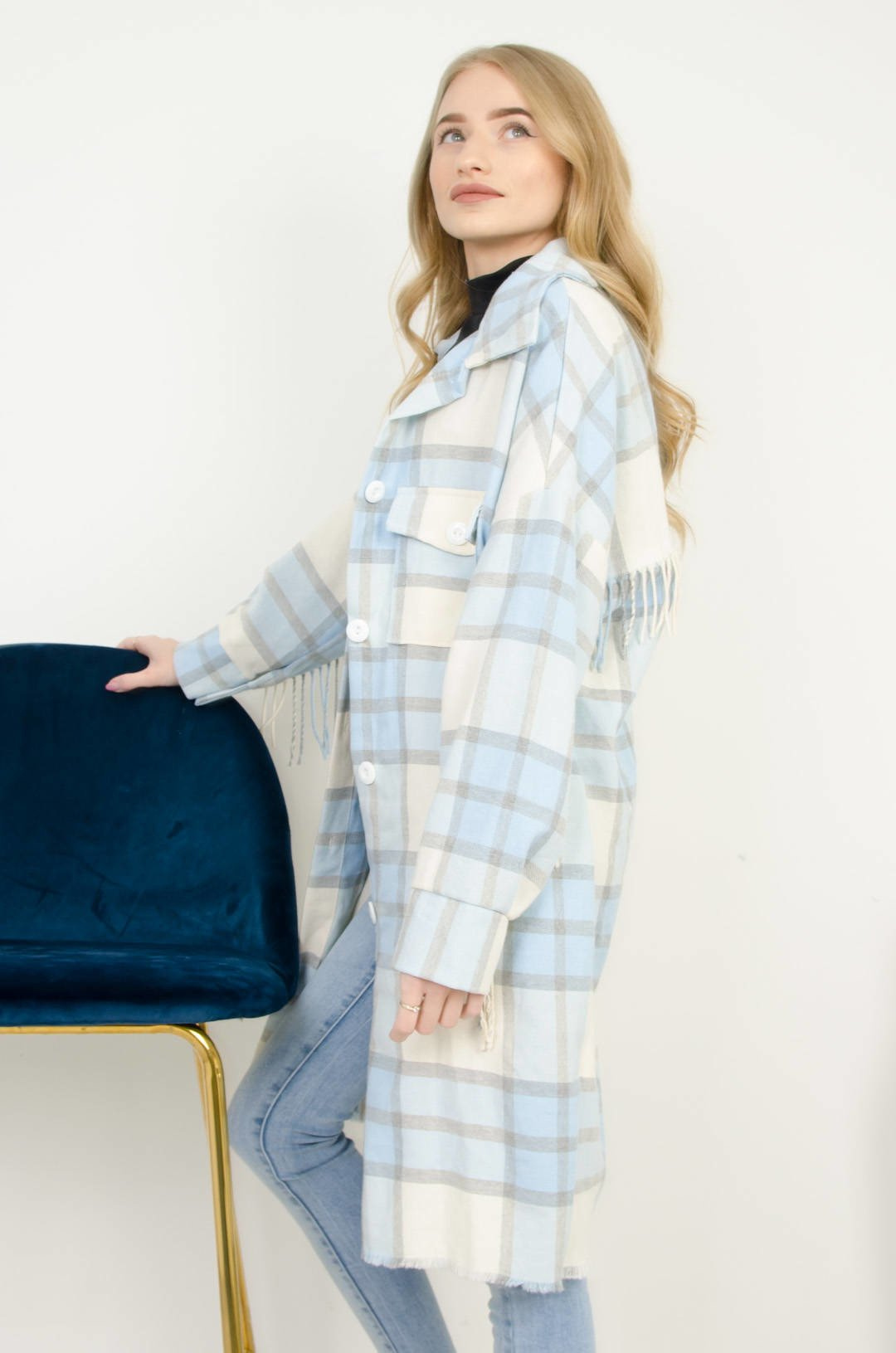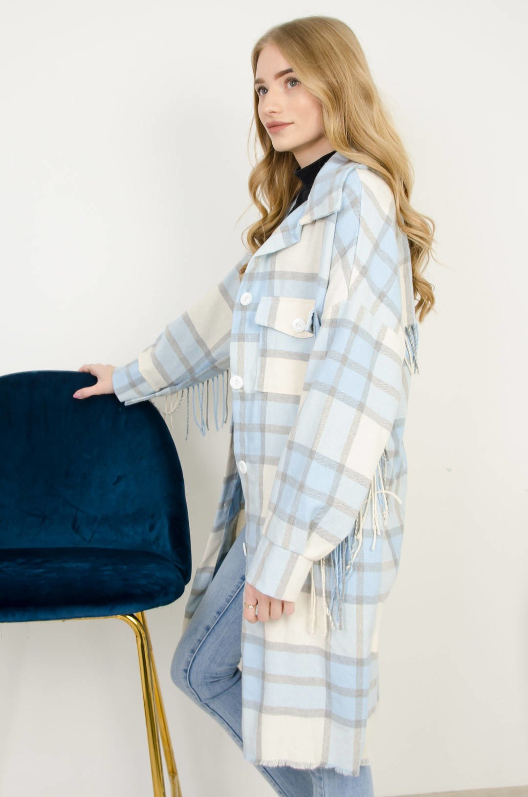 DŁUGA BAWEŁNIANA KOSZULA W KRATĘ Z FRĘDZLAMI BIAŁO-NIEBIESKA