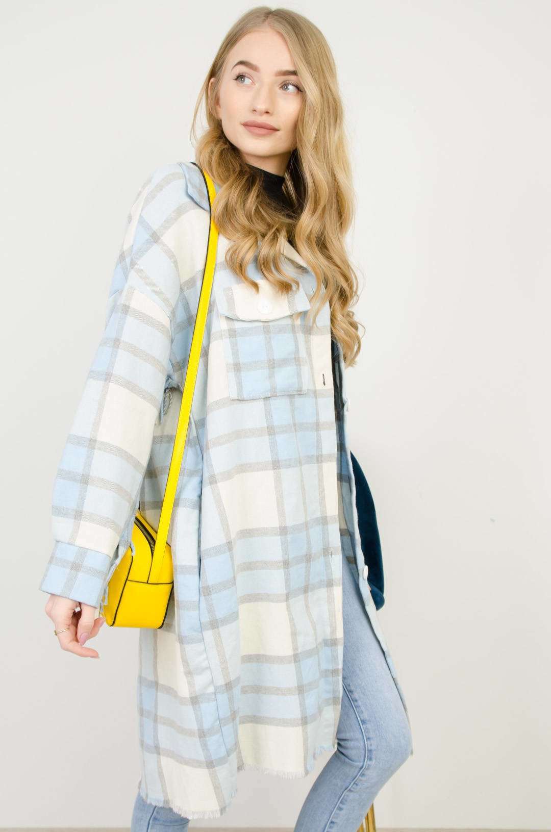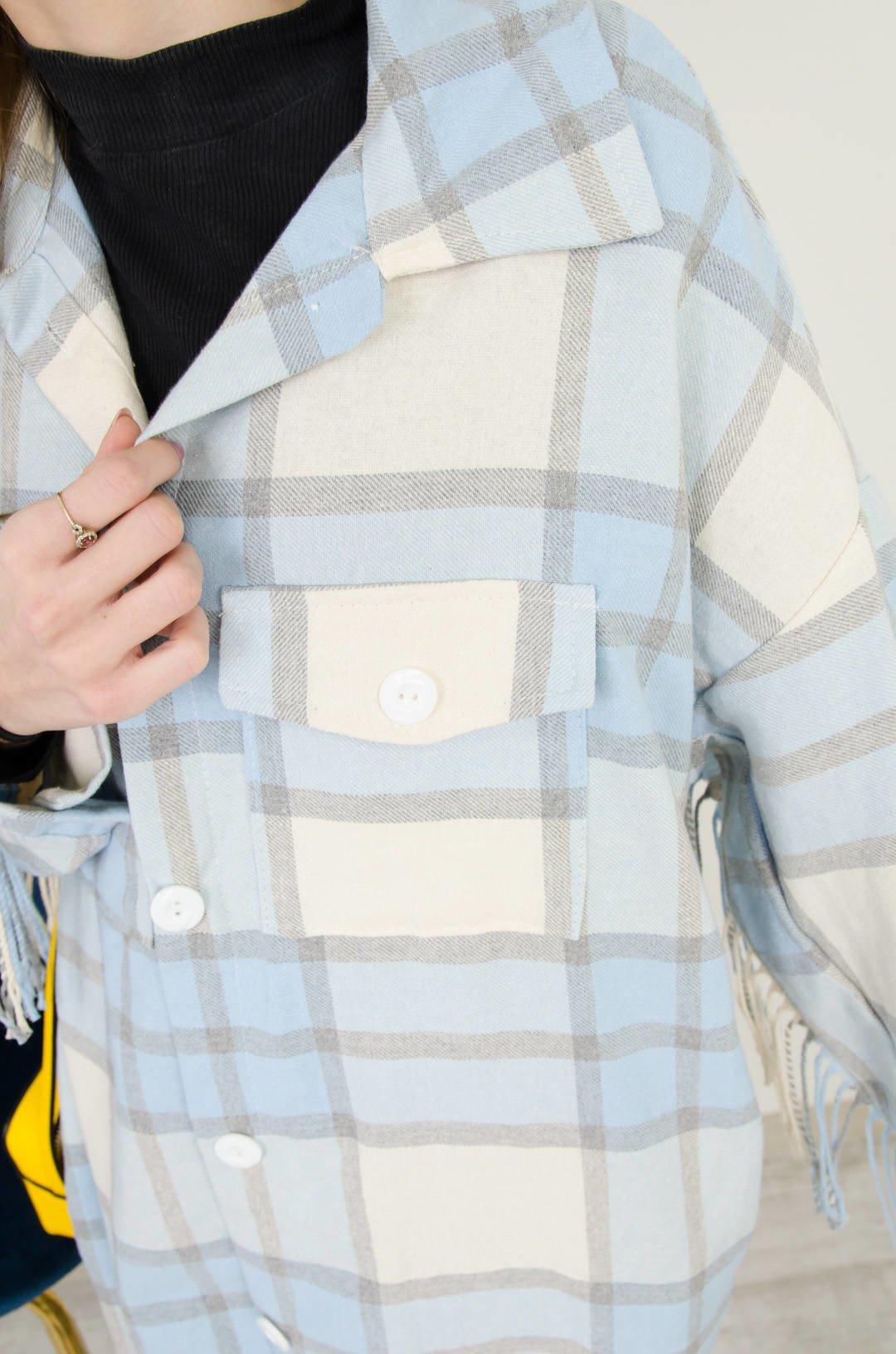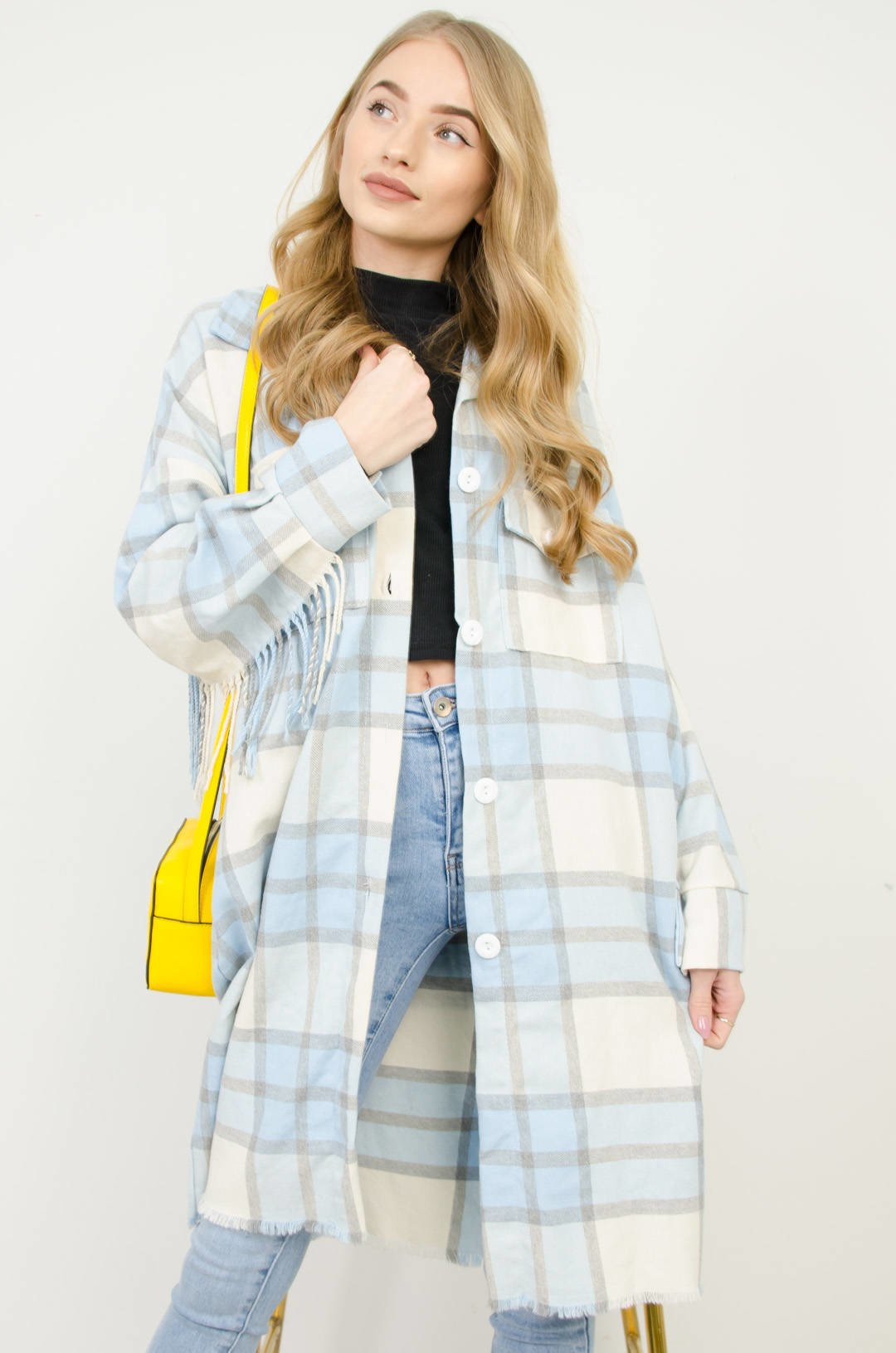 DŁUGA BAWEŁNIANA KOSZULA W KRATĘ Z FRĘDZLAMI BIAŁO-NIEBIESKA