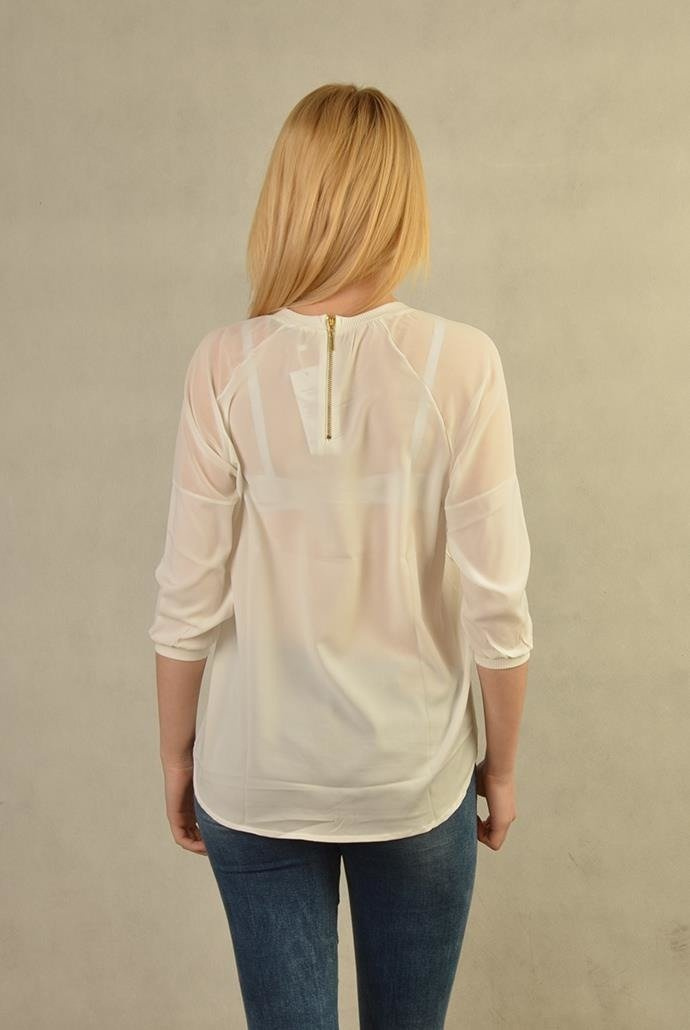 Bluzka gładka z rękawkiem o długości 3/4, posiada ściągacze przy rękawach, oraz dekolcie, z tyłu zapinana na zamek.