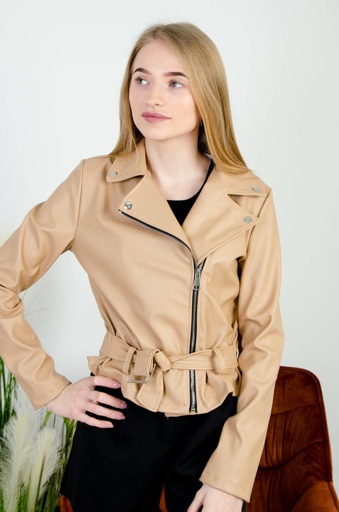 BEŻOWA RAMONESKA Z EKO SKÓRY Z PASKIEM