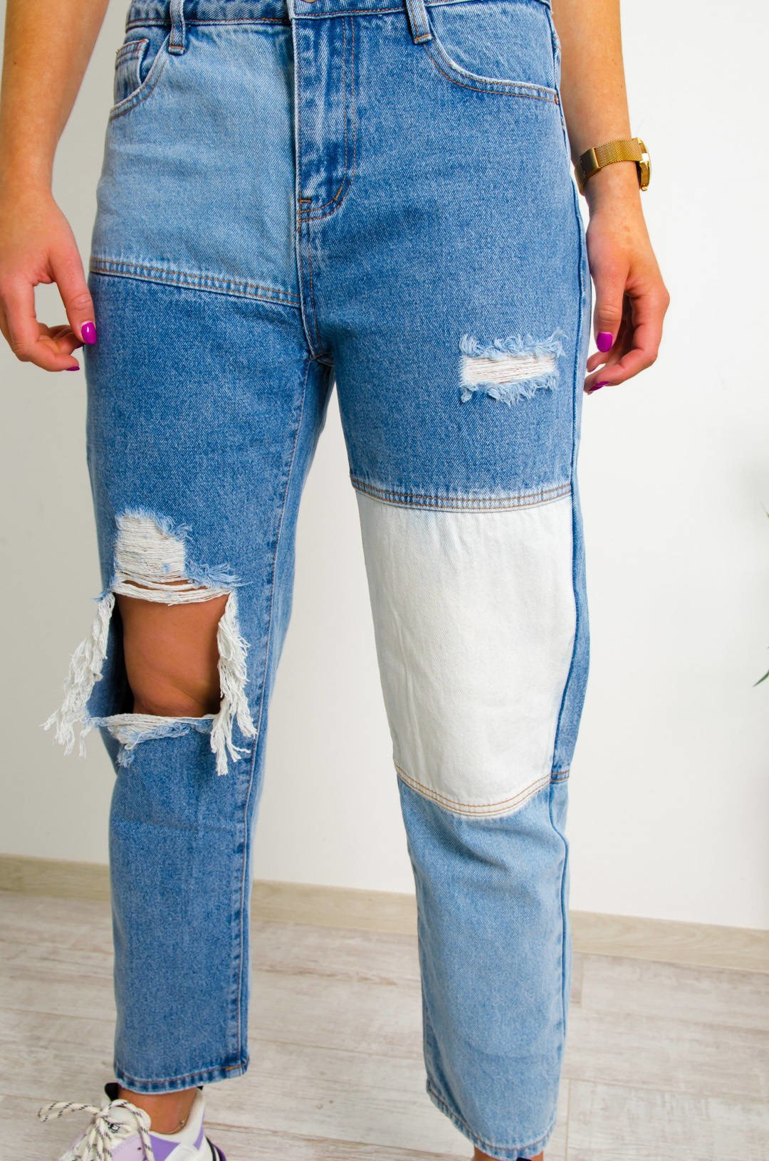 PATCHWORKOWE JEANSY O KROJU STRAIGHT WIDE