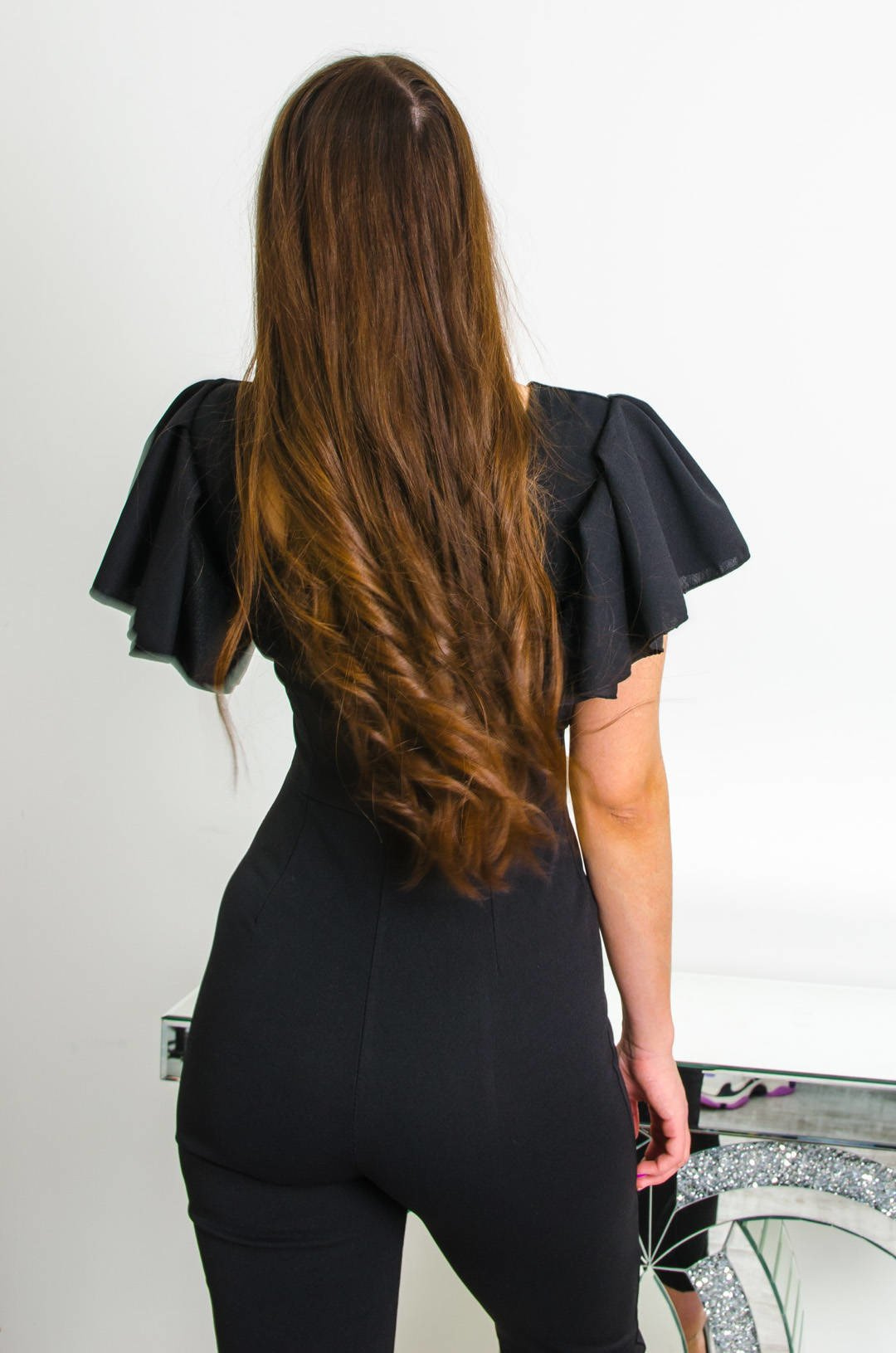 CZARNY KOMBINEZON Z FALBANĄ W RAMIONACH-WYCIĘCIE W DEKOLCIE I PLECACH " V"