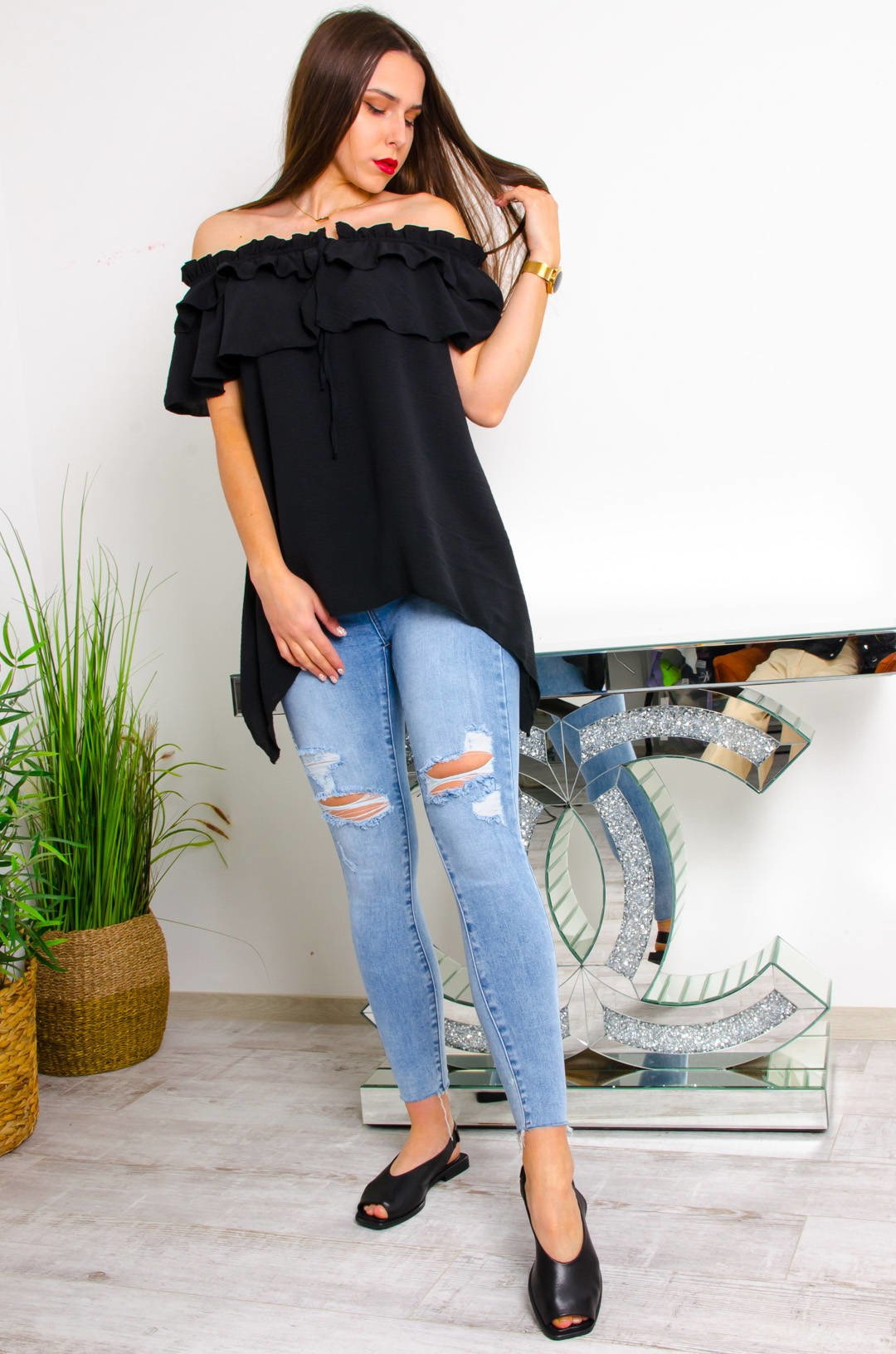 CZARNA BLUZKA Z FALBANĄ ORAZ DŁUŻSZYMI BOKAMI