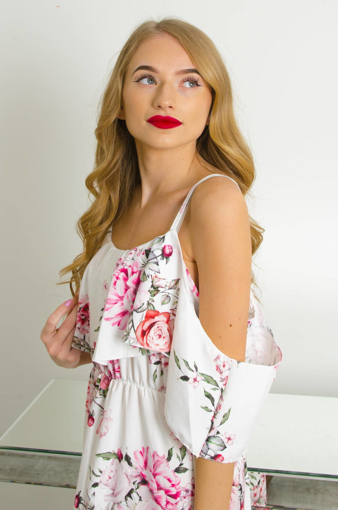 DŁUGA BIAŁA SUKIENKA W KWIATY NA CIENKICH RAMIĄCZKACH MAXI