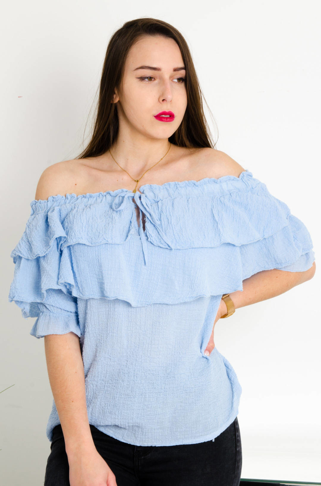 NIEBIESKA MUŚLINOWA BLUZKA HISZPANKA