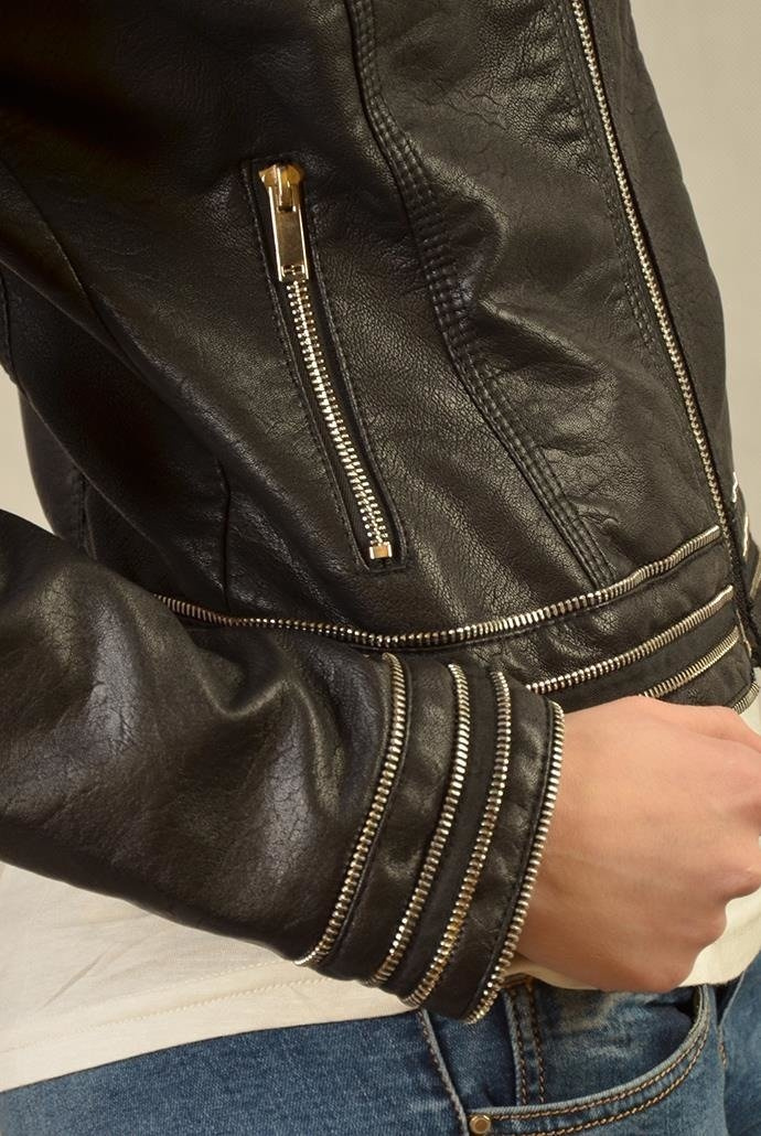 Kurtka zapinana na suwak, wykonana ze skóry ekologicznej, po bokach dwie zapinane kieszenie. Przy rękawach, oraz u dołu ozdobne zamki.