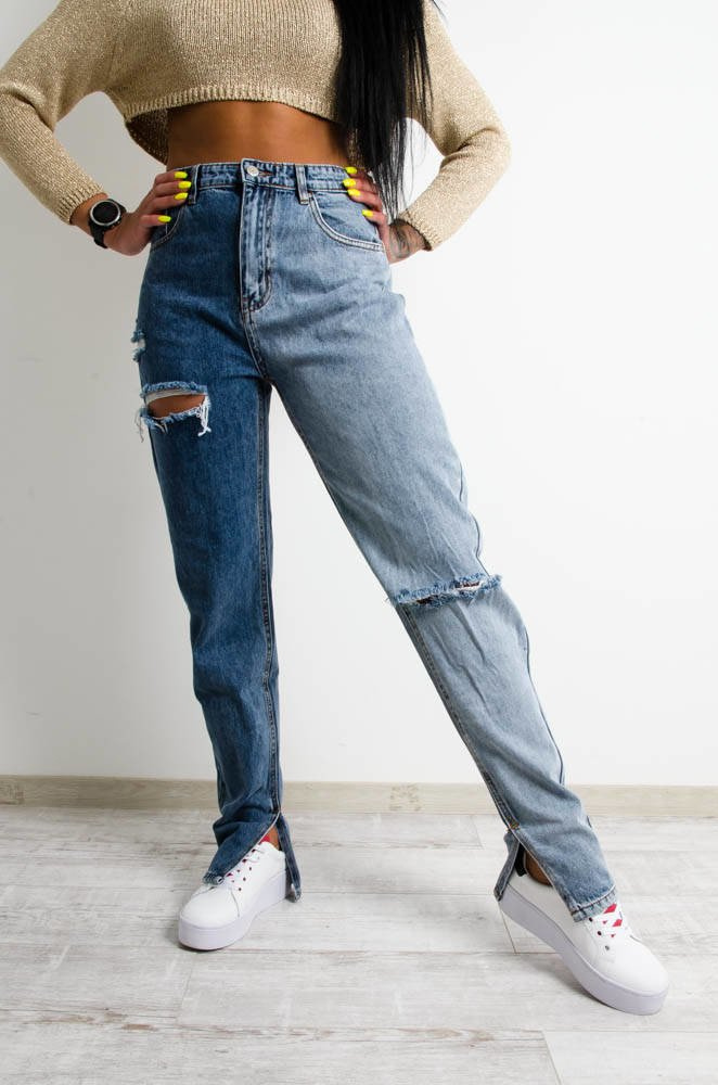 SPOENIE JEANSOWE Z DZIURAMI  I ROZCIĘCIEM NA NOGAWCE - WYSOKI STAN