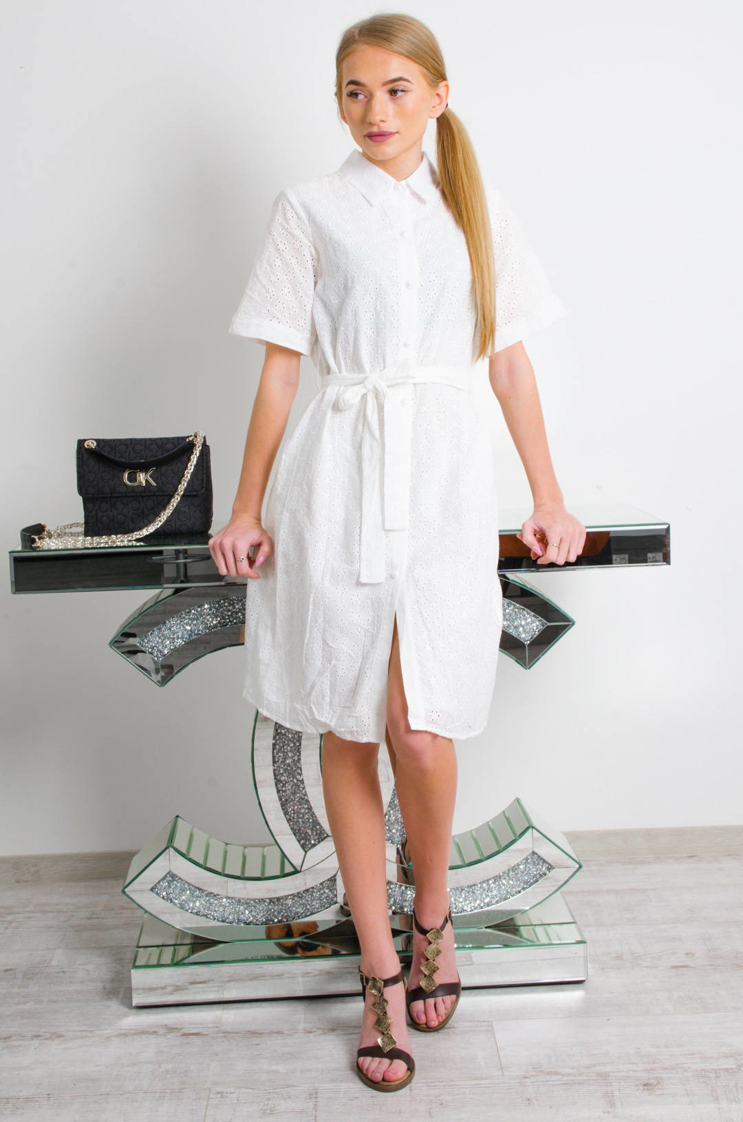 BIAŁA AŻUROWA SUKIENKA Z KOŁNIERZEM WIĄZANA W PASIE
