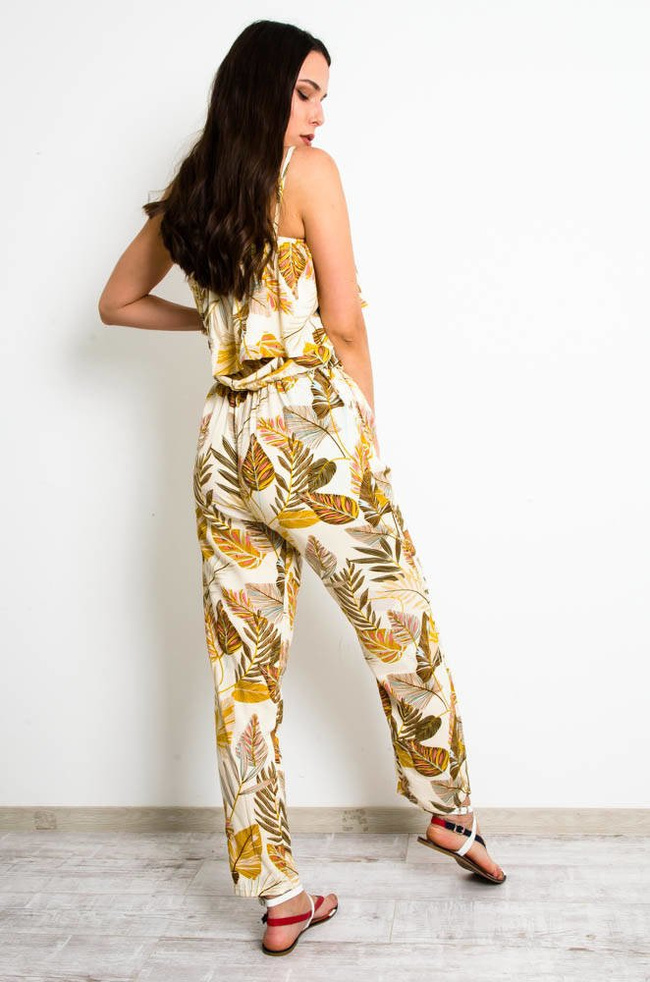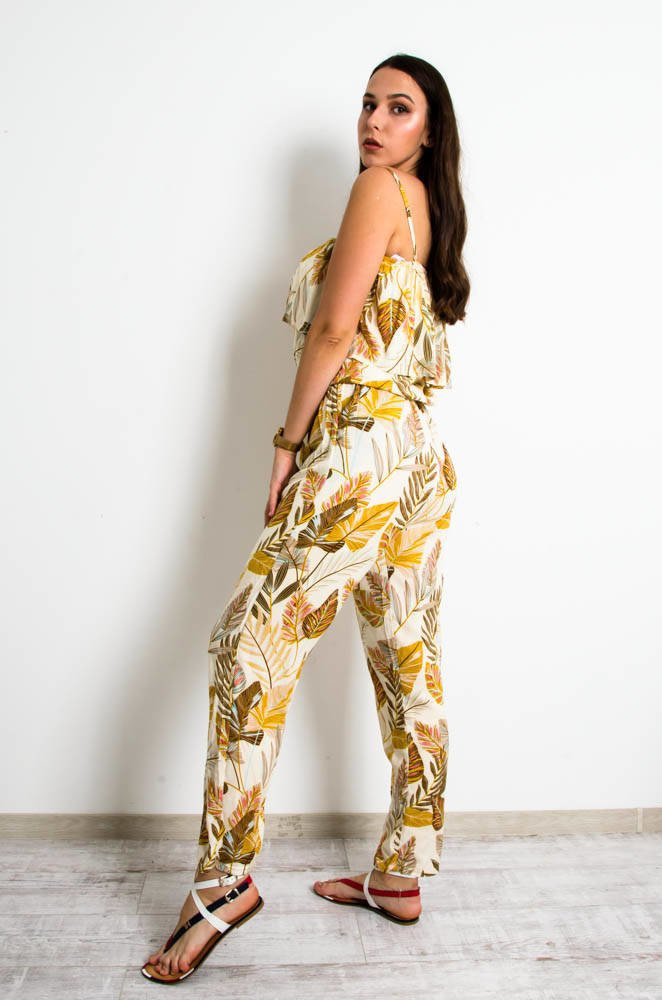 BEŻOWY KOMBINEZON W KWIATY Z HISZPAŃSKIM DEKOLTEM