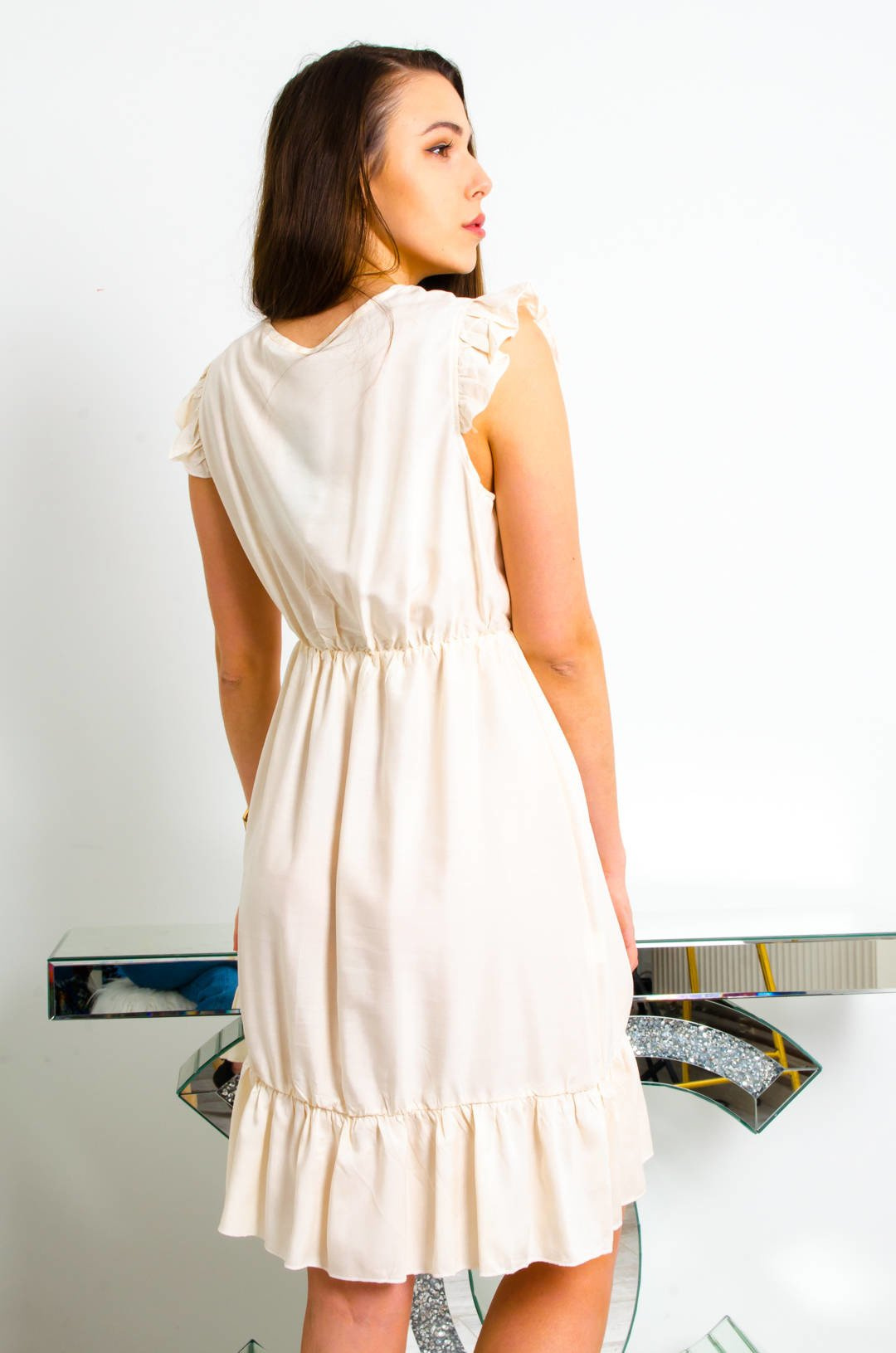 KREMOWA KRÓTKA ZWIEWNA SUKIENKA Z KOPERTOWYM DEKOLTEM