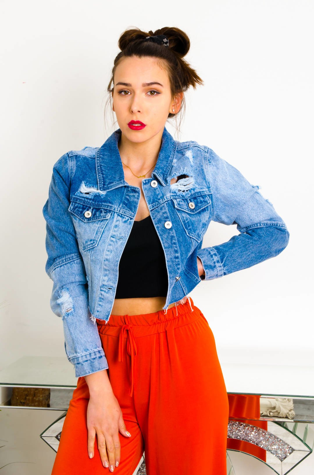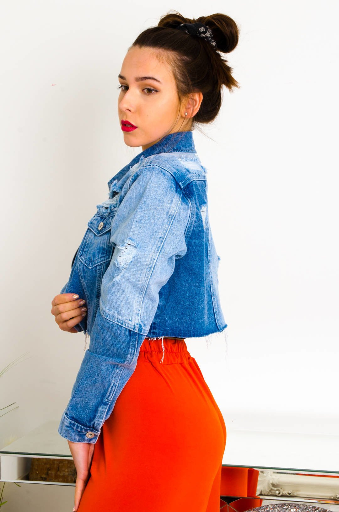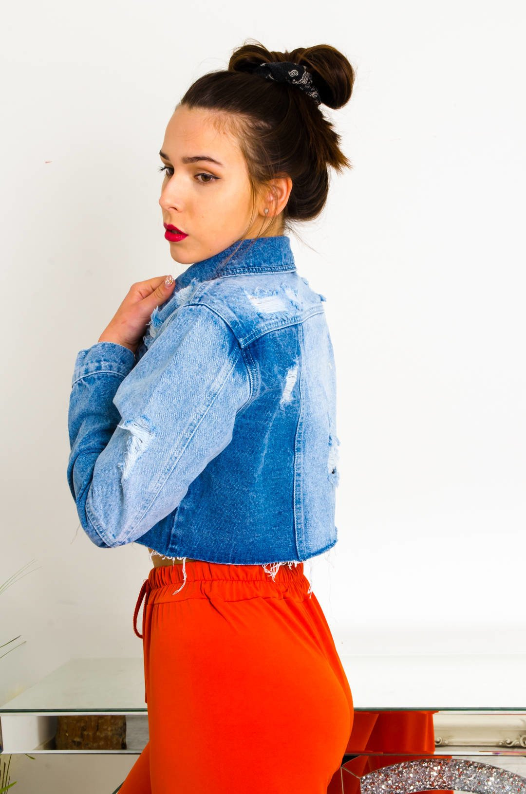 KRÓTKA KURTKA JEANSOWA Z ŁĄCZONYCH MATERIAŁÓW