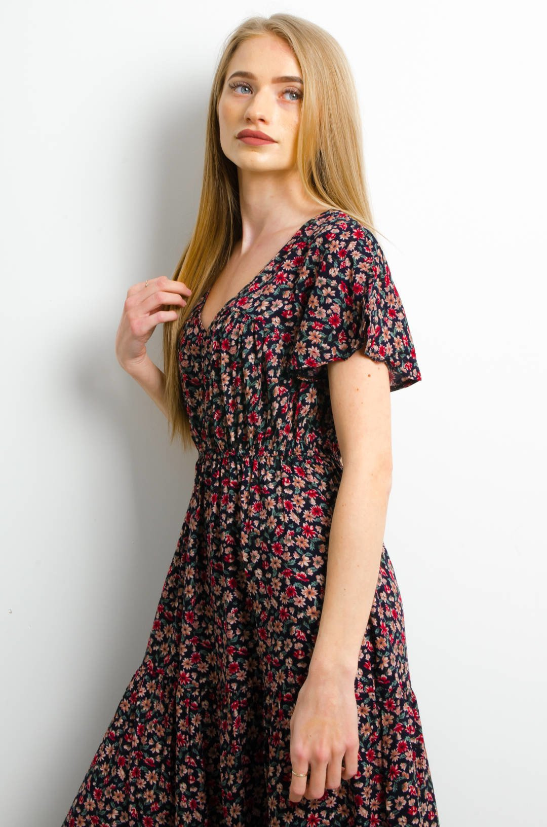 DŁUGA GRANATOWA SUKIENKA W KWIATY- DEKOLT W SEREK