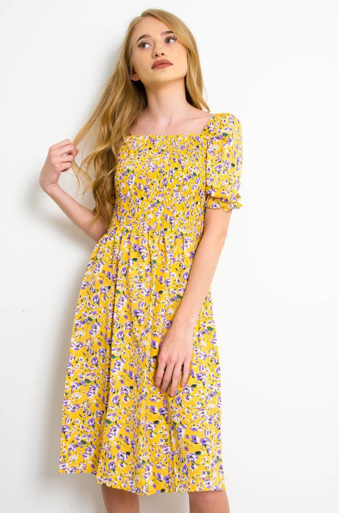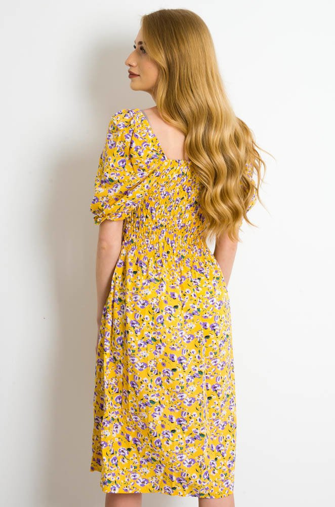 ŻÓŁTA SUKIENKA Z BUFKAMI W DROBNE FIOLETOWE KWIATY