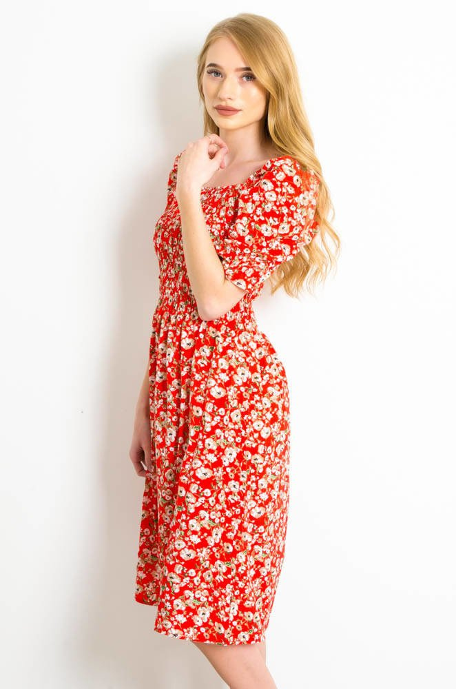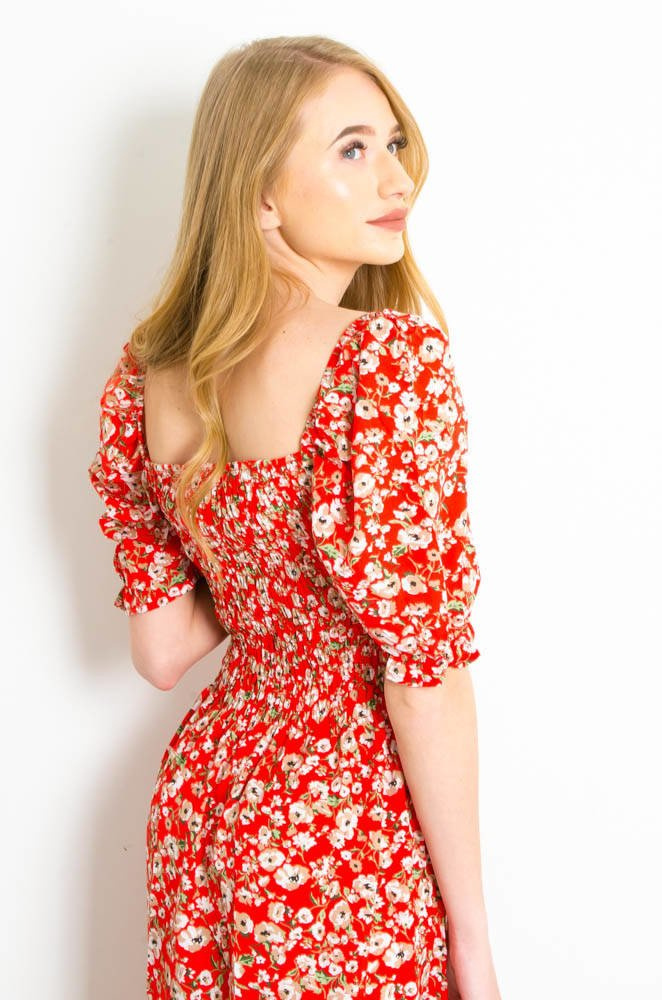 CZERWONA SUKIENKA Z BUFKAMI W DROBNE KWIATY