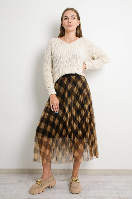 BRĄZOWA SPÓDNICA TIULOWA W KRATĘ