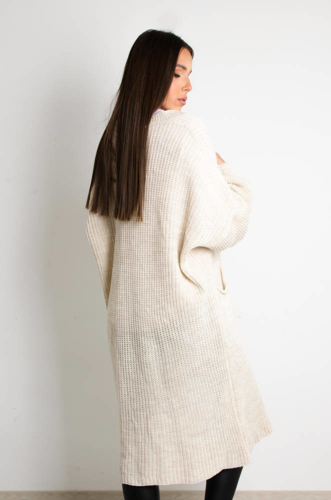 BEŻOWY DŁUGI SWETER KARDIGAN Z SZEROKIMI RĘKAWAMI
