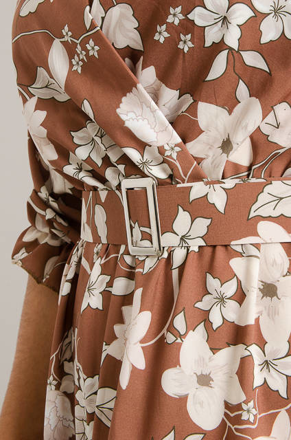 BRĄZOWA SUKIENKA MAXI W KWIATY Z PASKIEM