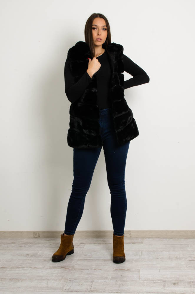 CZARNA FUTRZANA KAMIZELKA Z KAPTUREM