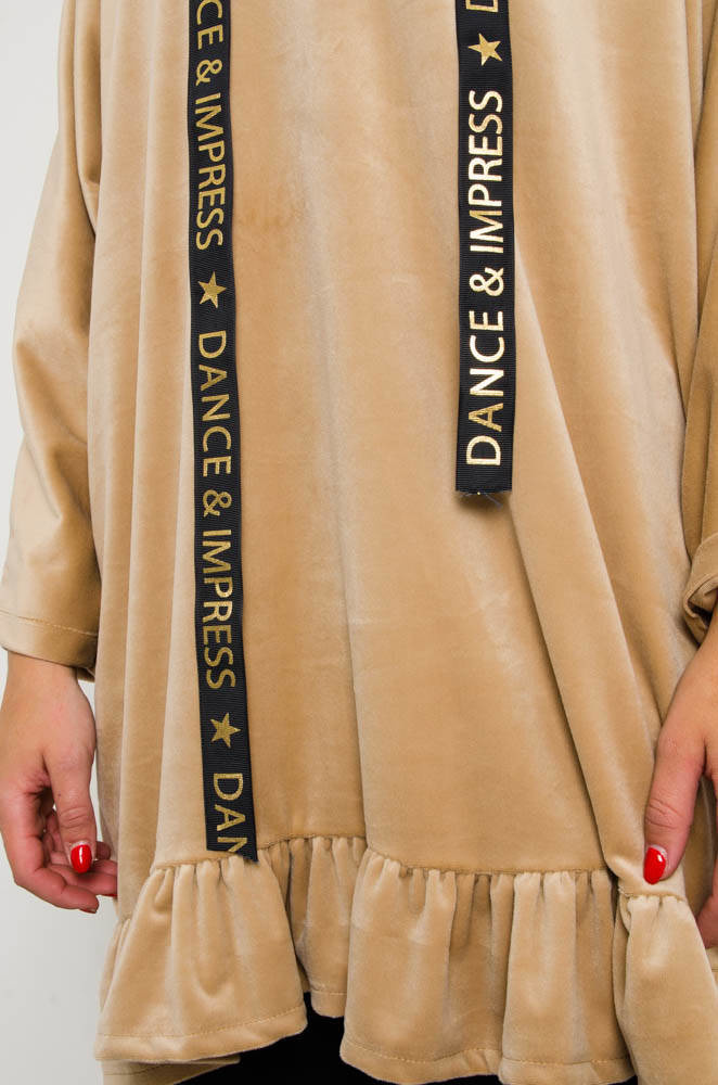 BEŻOWA WELUROWA SUKIENKA Z FALBANĄ