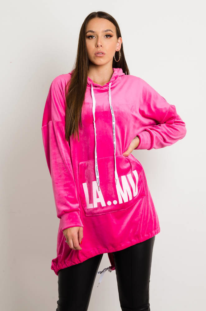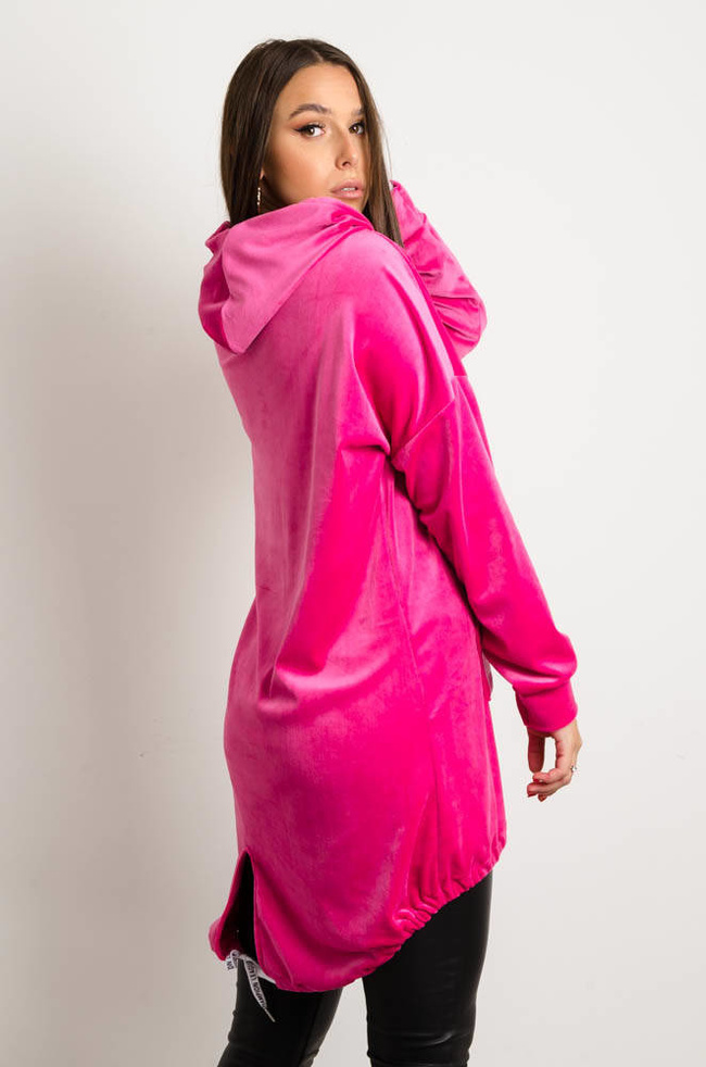 RÓŻOWA WELUROWA SUKIENKA Z KAPTUREM