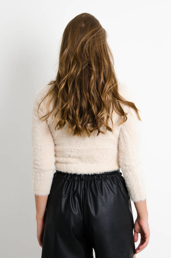 BEŻOWY WŁOCHATY SWETEREK Z DEKOLTEM W SEREK