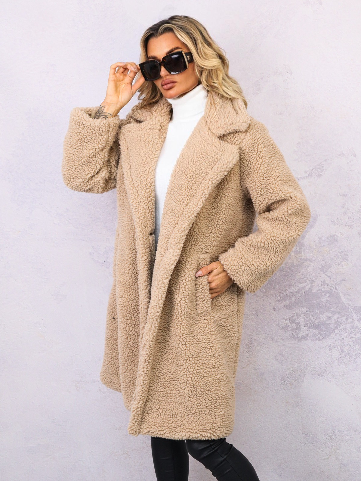 BRĄZOWY PŁASZCZ PLUSZOWY Z KOŁNIERZEM