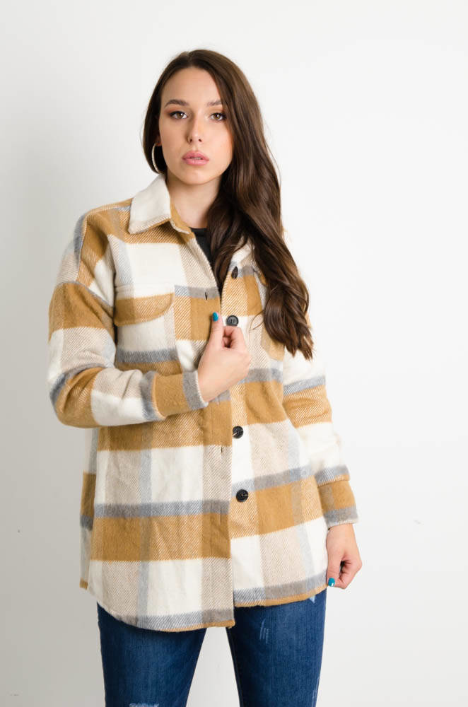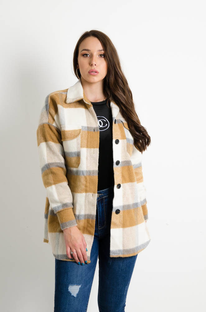 BRĄZOWY PŁASZCZ KOSZULOWY W KRATĘ
