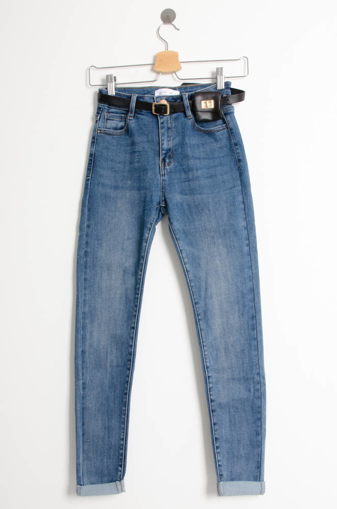 Jeansy z funkcją stretchu, który trzyma i modeluje talię, uda i pośladki oraz zachowuje kształt jeansów. Wysoki stan, rozporek na suwak i guzik. Obcisłe nogawki. Pasek z nerką w zestawie.
