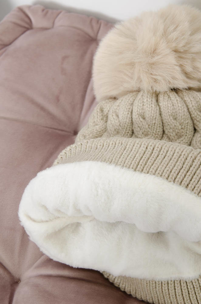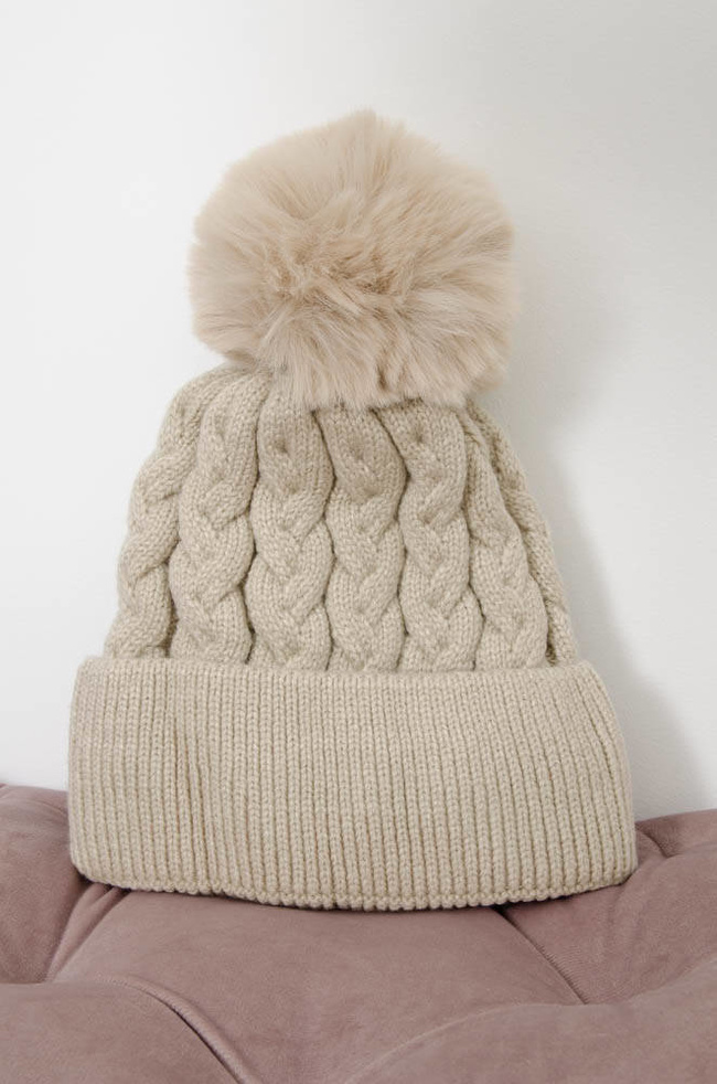 BEŻOWA ZIMOWA CZAPKA PLECIONA Z POMPONEM