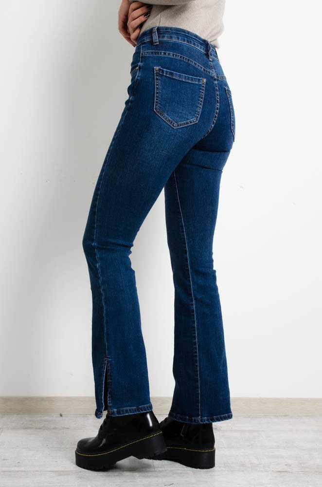 Jeansy z lekko elastycznego denimu z wysokim stanem. Rozporek zapinany na guzik i i suwak. Szerokie nogawki z rozcięciem.