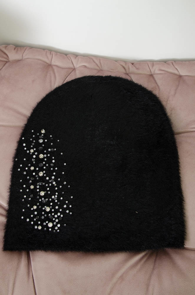 CZARNA FUTRZANA CZAPKA Z OZDOBNYMI KRYSZTAŁKAMI