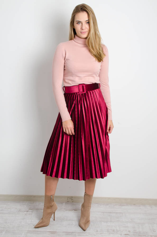 BORDOWA WELUROWA PLISOWANA SPÓDNICA Z PASKIEM-MIDI