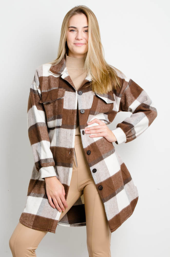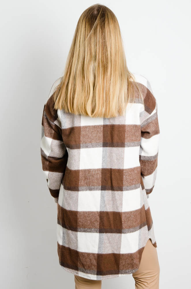 BRĄZOWY PŁASZCZ KOSZULOWY W KRATĘ