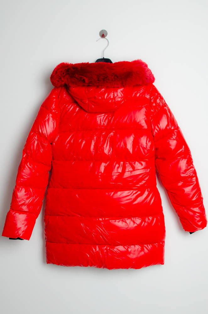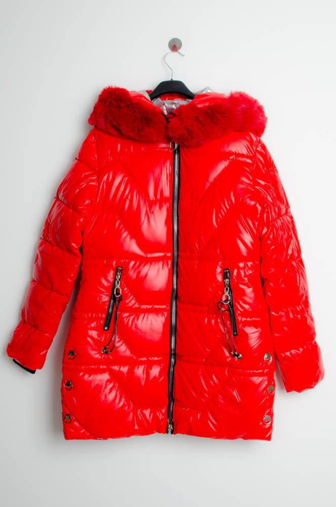 CZERWONA PIKOWANA KURTKA Z KAPTUREM .