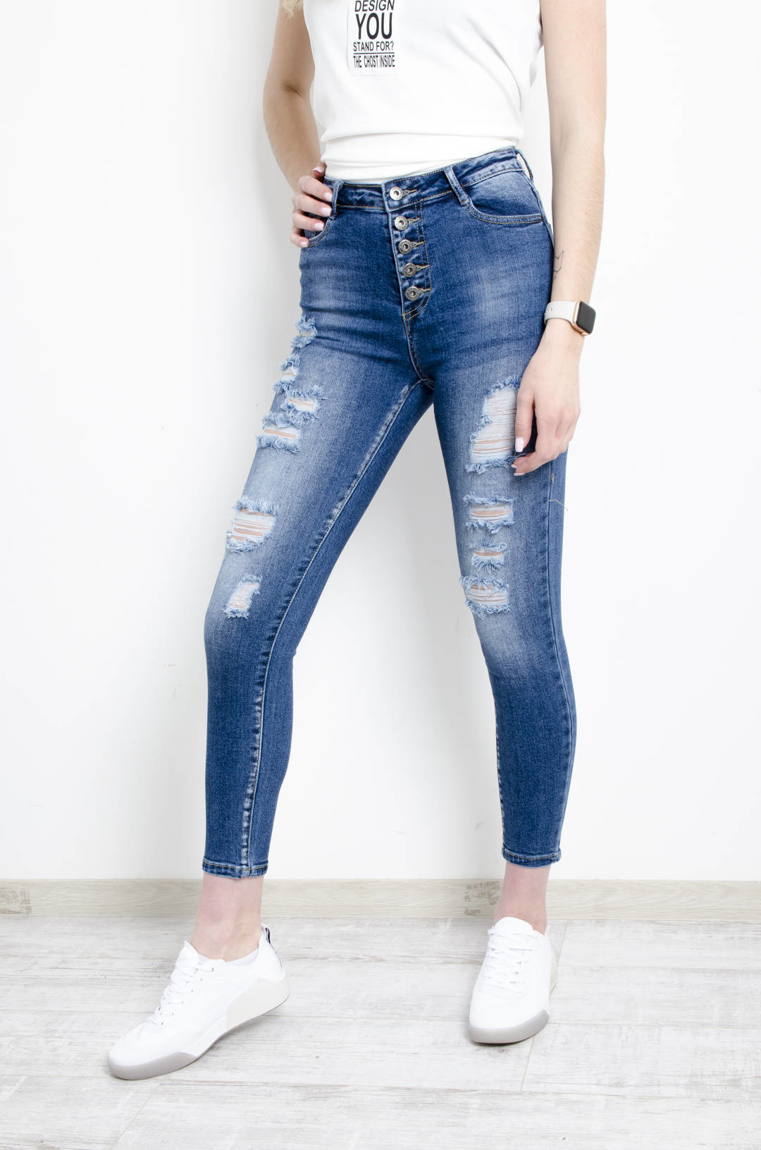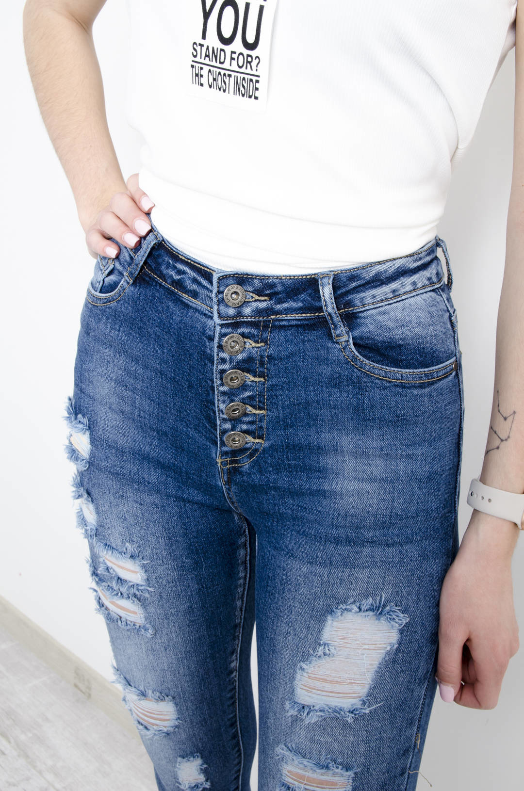 Jeansy z funkcją stretchu, który trzyma i modeluje talię, uda i pośladki oraz zachowuje kształt jeansów. Wysoki stan, rozporek na guziki. Obcisłe nogawki z dziurami i przetarciami..