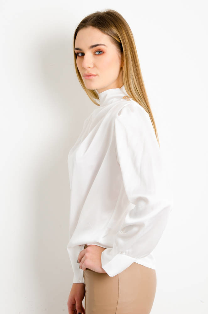 BIAŁA SATYNOWA BLUZKA Z OZDOBNYMI GUZIKAMI NA RAMIONACH