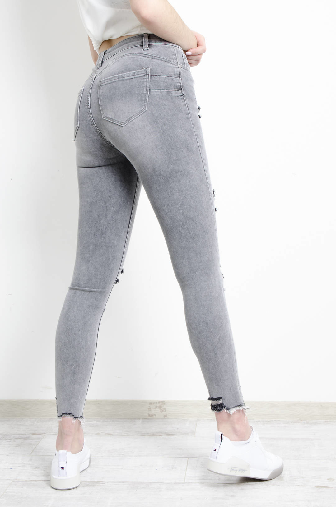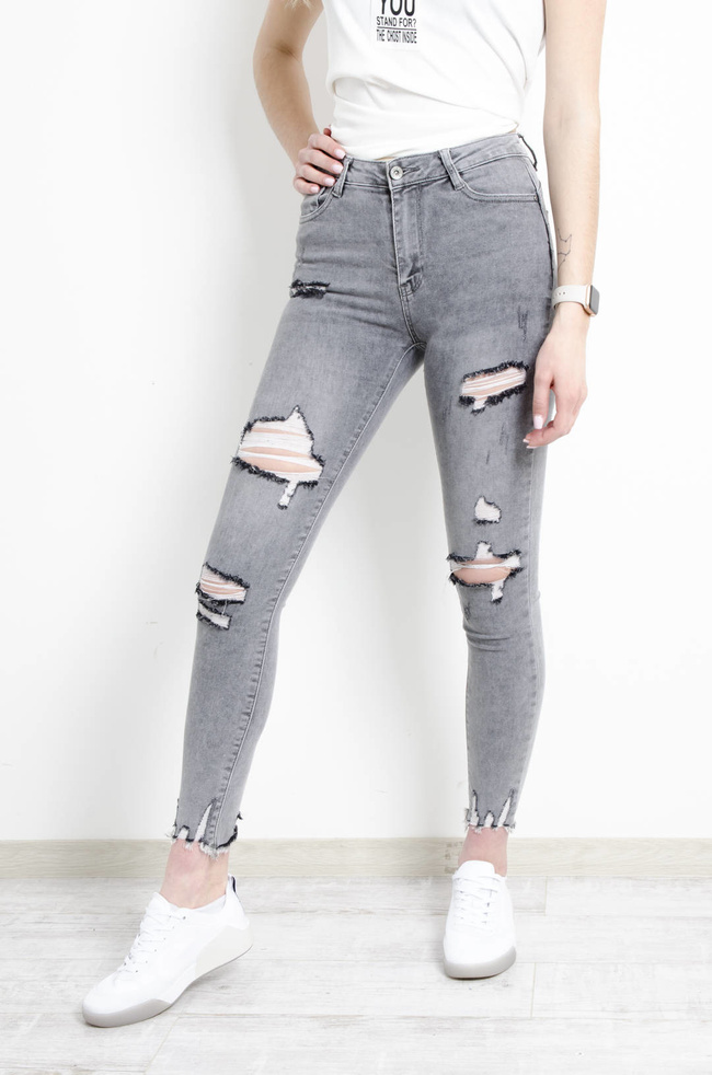 SPODNIE JEANSOWE SZARE PUSH UP Z SZARPANIAMI