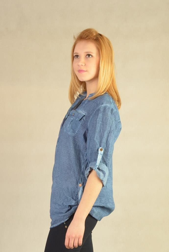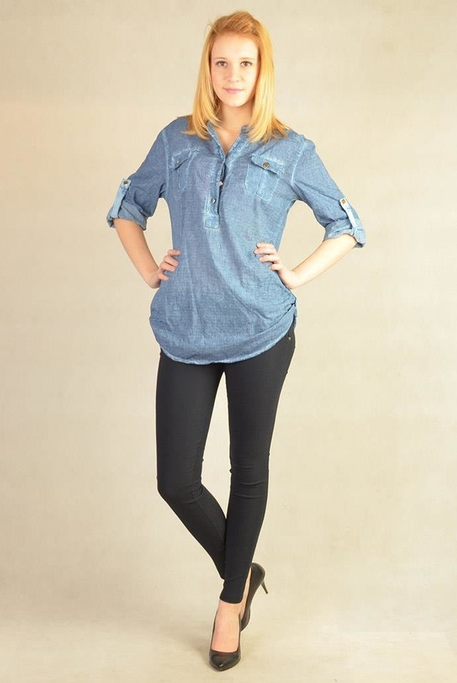 Bluzka koszulowa, zwiewna, prosta i bardzo kobieca. Posiada rozcięcie przy dekolcie i dwie kieszonki na klatce piersiowej, które dodatkowo dodają jej uroku.