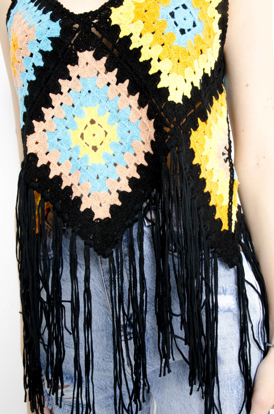 BLUZKA AŻUROWA NA RAMIĄCZKA Z FRĘDZLAMI - CZARNA