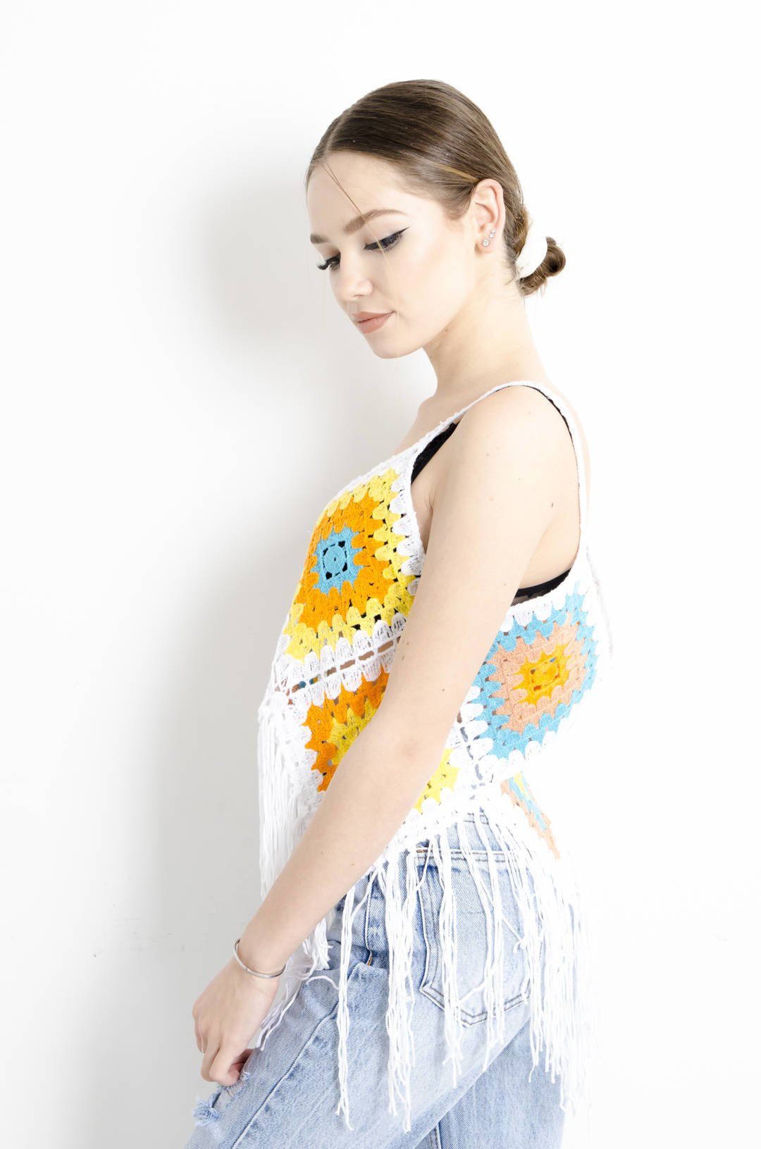 BLUZKA AŻUROWA NA RAMIĄCZKA Z FRĘDZLAMI - BIAŁA