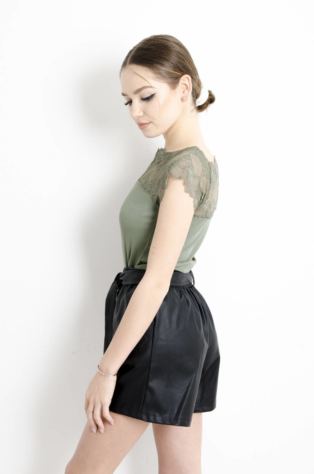 BLUZKA PRĄŻKOWANA Z KORONKĄ - KHAKI