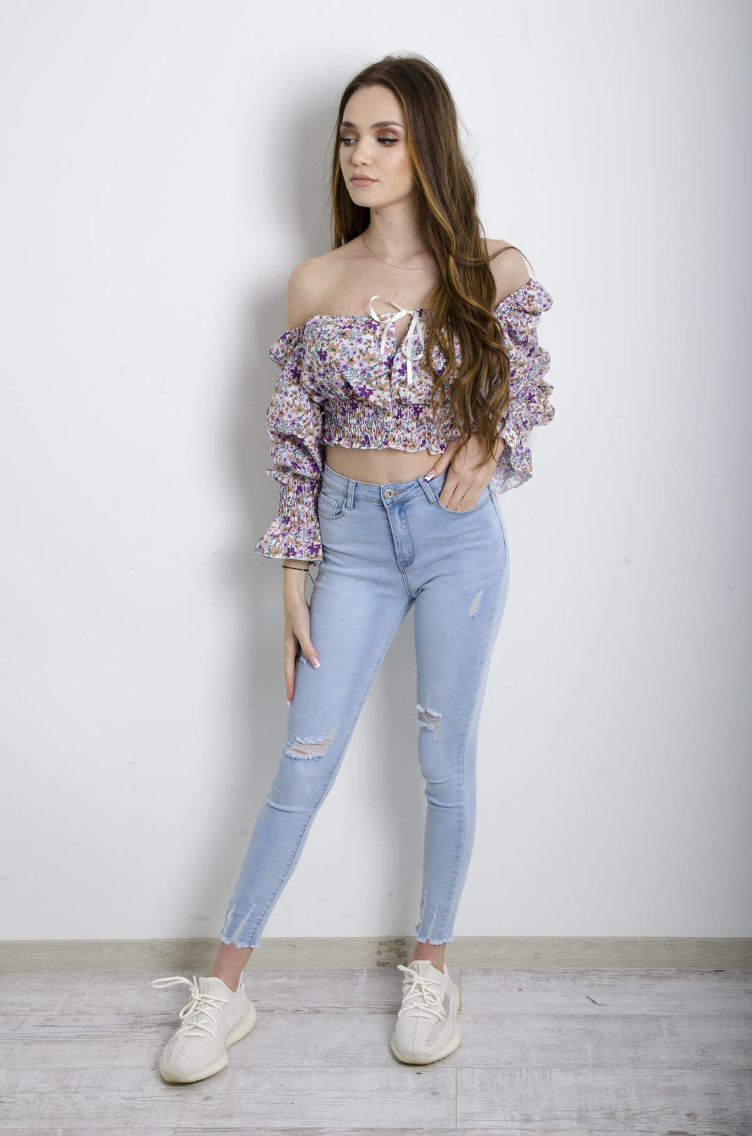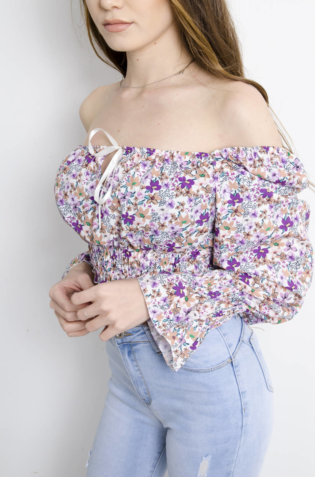 BLUZKA HISZPANKA BIAŁO-FIOLETOWA W DROBNE KWIATY