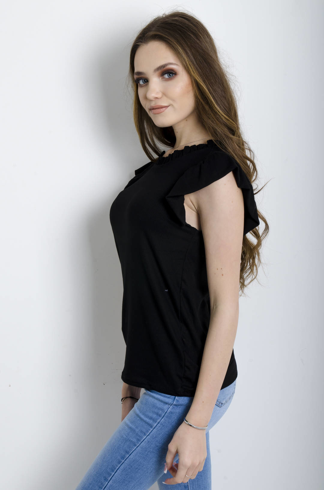 BLUZKA PRĄŻKOWANA Z FALBANKĄ CZARNA