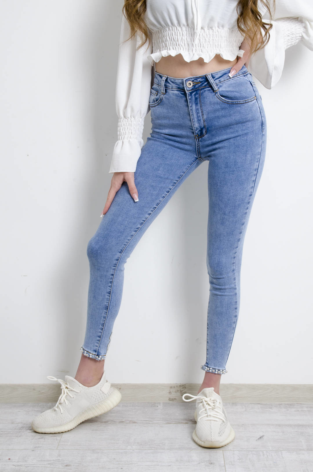 SPODNIE JEANSOWE Z OZDOBNYMI KORALIKAMI I KOKARDĄ