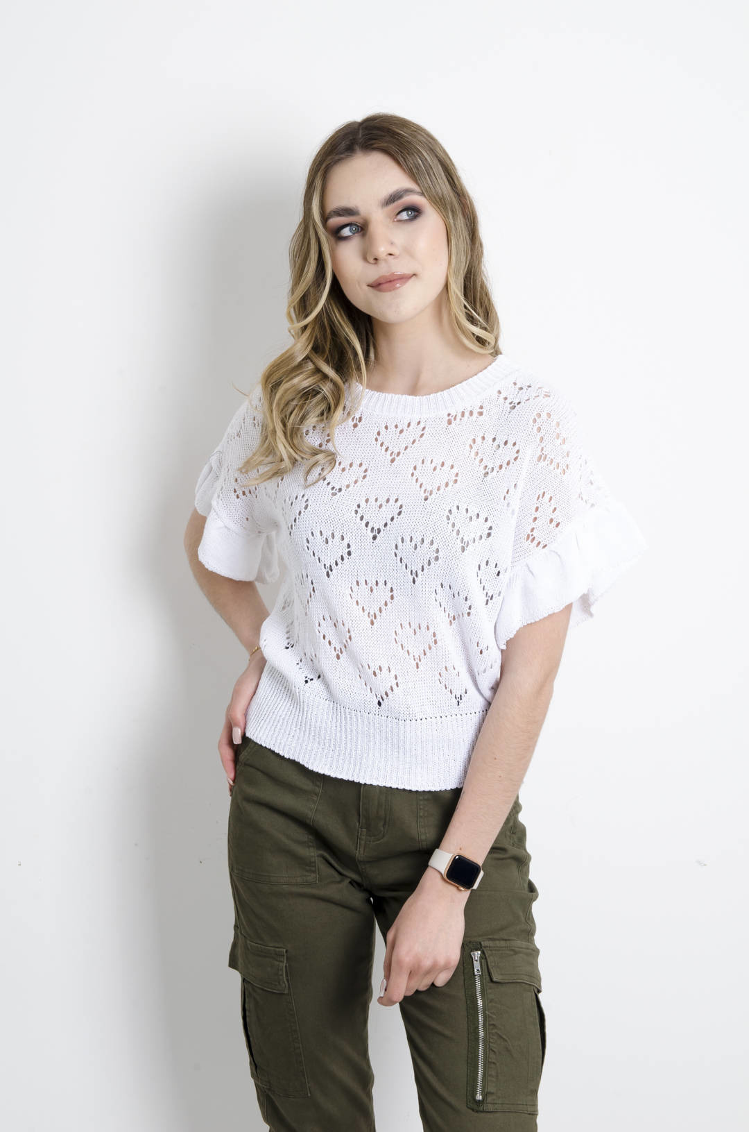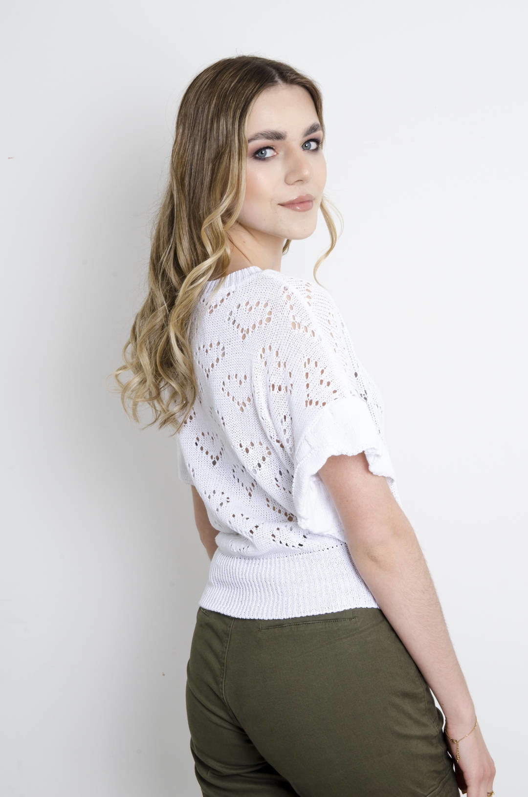 SWETEREK W SERDUSZKA AŻUROWY Z FALBANAMI PRZY RĘKAWACH- BIAŁY